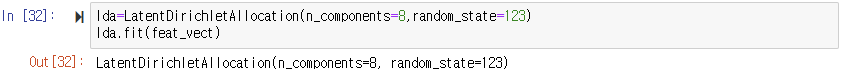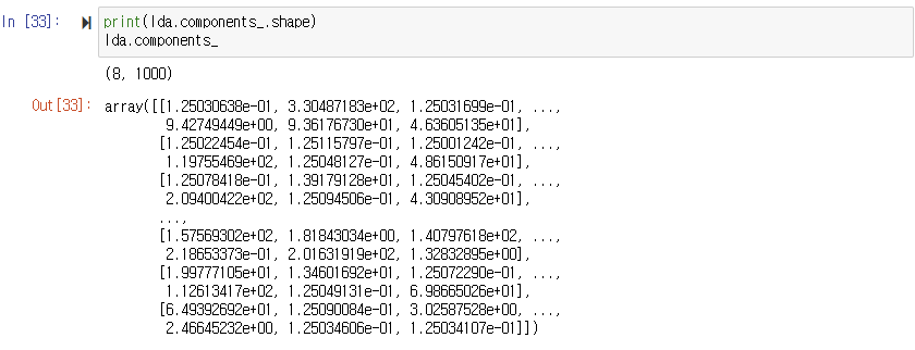 CountVectorizer 객체 변수인 feat_vect 모두 7862개의 문서가 1000개의 피처로 구성된 행렬 데이터가 된 것을 알 수 있다. LatentDirichletAllocation 클래스의 n_components 파라미터를 이용해 토픽 개수를 조정할 수 있다. 여기서는 cats의 수를 8개로 앞서 추려놓았기 때문에 8로 설정해 주었다.