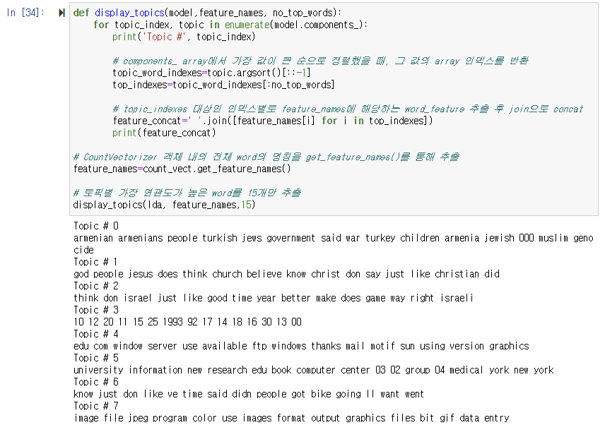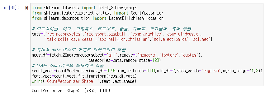 머신러닝 기반 초픽 모델링에 자주 사용되는 기법은 LSA와 LDA이다. 이번에는 LDA만 사용해서 토픽 분류를 진행해보았다. 사이킷런은 LDA 기반의 초픽 모델링을 LatentDirichletAllocation 클래스로 제공한다. 먼저 LDA 토픽 모델링을 위해 fetch_20newsgroups() API는 categories 파라미터를 통해 필요한 주체만 필터링해 추출하고 추출된 텍스트를 Count 기반으로 벡터화 변환하였다. 여기서 LDA는 Count기반의 벡터화만 사용한다. max_features=1000으로 word 피처의 개수를 제한하고, n_gram_range(1,2)로 설정하고 피처 벡터화 변환을 하였다.